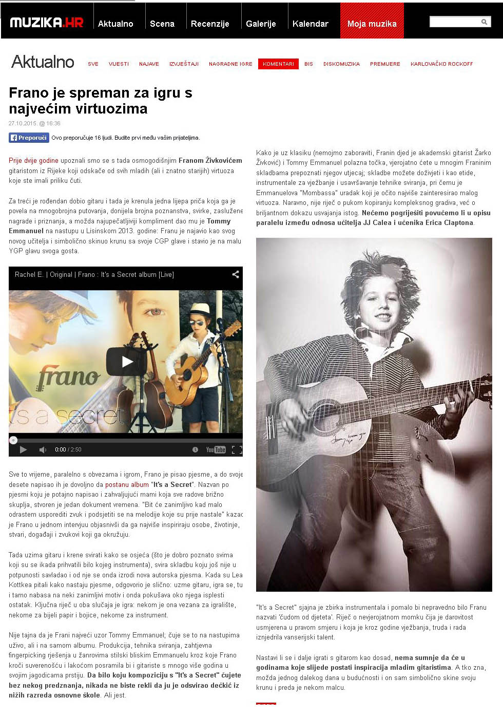 Jedanaestogodišnji Frano Živković najmlađi je član Hrvatskog društva skladatelja. To bi, samo po sebi, bila vijest tek za kakav okvirić u mozaičnoj rubrici dnevnih novina da Frano nije talentirani gitarist čije je umijeće već osvojilo brojne svjetske medije i privuklo pažnju australskog virtuoza, Tommyja Emmanuela. Gitaru počinje svirati već s tri godine, potom se hvata u koštac s violinom i klavirom, a odnedavno se u prodaji nalazi i njegov autorski album prijenac, „It's a secret“.